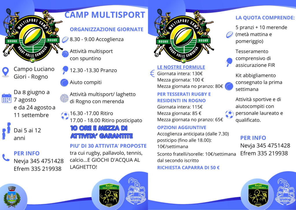 Regalate ai vostri figli un'estate indimenticabile, iscriveteli al MultiSport Camp ASD Rugby Valle Camonica e 2H Skorpions, con il patrocinio...